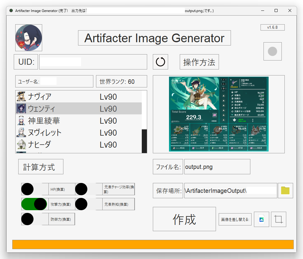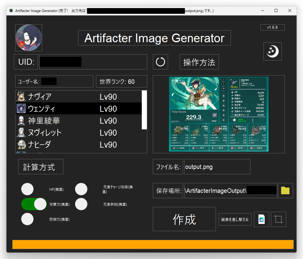 ArtifacterImageGen - Easy Genshin Build Card Creater - Artifacter for Windowsは寄付を募っています。開発の励みになりますので寄付をお願いします 使い方(How to Use) python3 ArtifacterImageGenerator-GUI.py ScreenShot GUI版の画像出力先 Windowsなら「%USERPROFILE%\ArtifacterImageOutput\「UID」」 Linuxなら「$HOME/ArtifacterImageOutput/「UID」/」 今後の予定 多言語化 画像の切り替えを分かりやすく調整 ライトモード / ダークモードの切り替えを自動化(実装できそうなら) コードの最適化と軽量化 他載せれそうな機能を追加 作者さん Hyugo様 コード書き換えした人 カズ様(@kaz_m_gaming) CrossDarkrix デザインのベースなどを作ってくれた方 pome-ta様(iOS版) Yuki'ch様(@Tsukishiro_527)