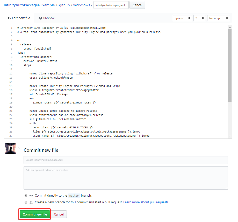 3. Open Infinity Auto Packager file, copy all content and paste it into the editor, then click "Commit new file" in order to save changes