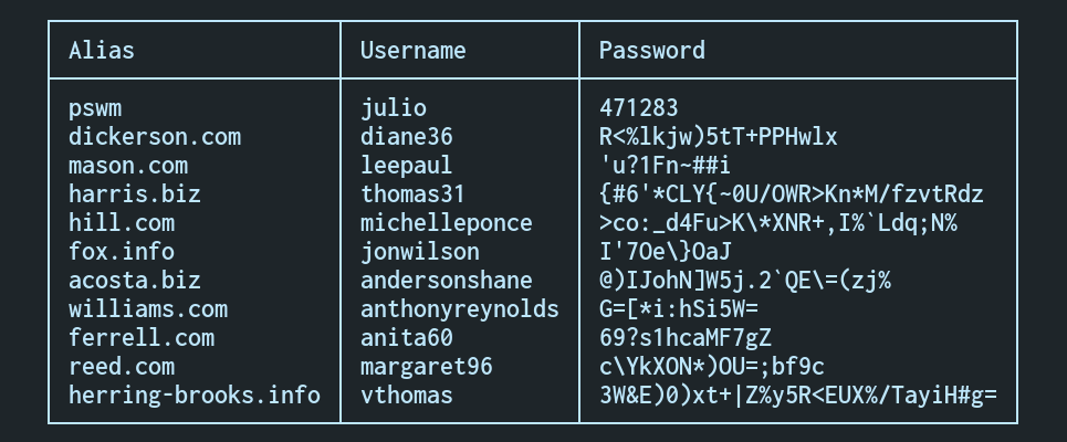 pswm <alias> <user> <password> - Store a username and a password.