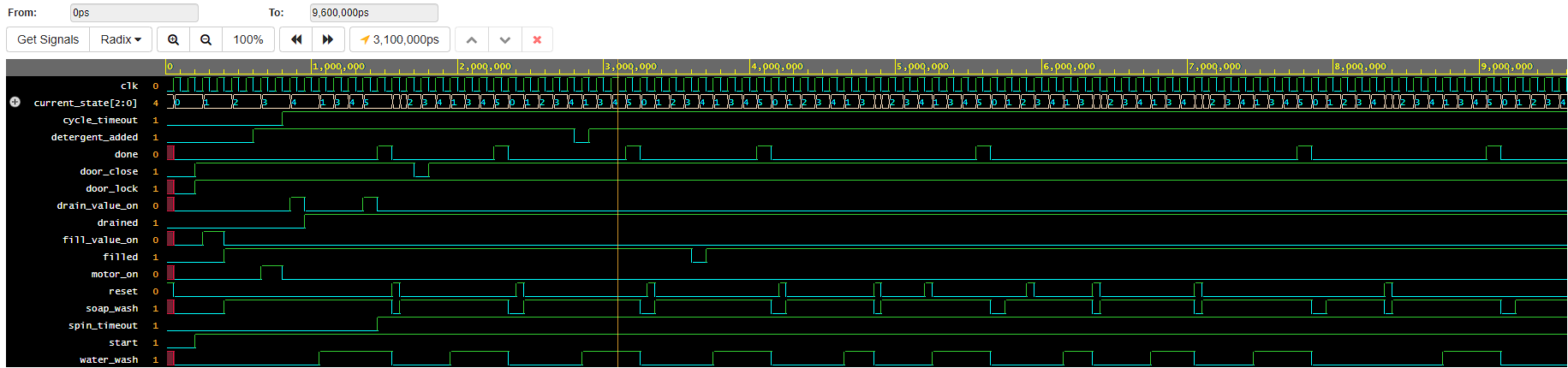 Signal Description door_lockControls the door lock mechanism motor_onControls the washing machine motor fill_value_onControls the water fill valve drain_value_onControls the water drain valve doneIndicates if the washing process is complete soap_washIndicates if the soap wash cycle is active water_washIndicates if the water rinse cycle is active -