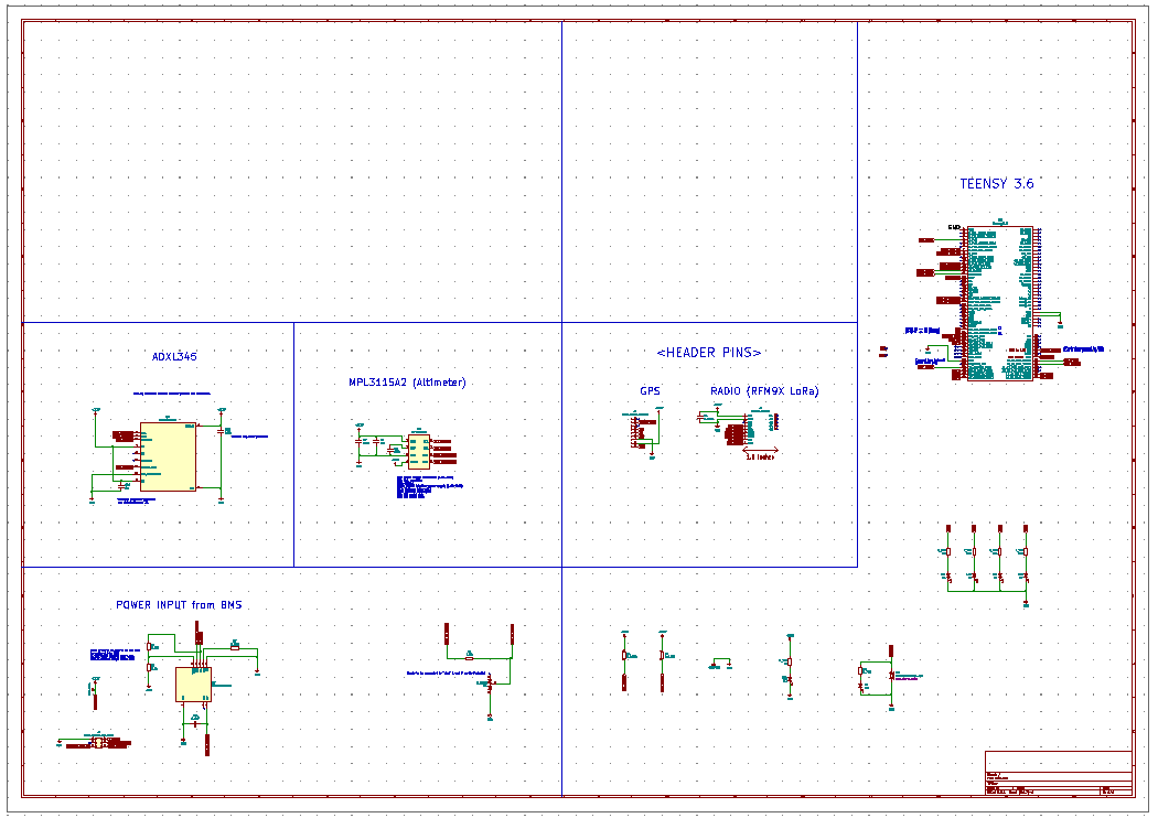 - Now all the schematics can be hooked up together; in this case it means connecting each sensor’s communication pins to the Teensy and power and ground to the power supply. A small circuit for regulating the power supply from the BMS, as well as header pins for the BMS and GPS and radio breakout boards are also added to this schematic.