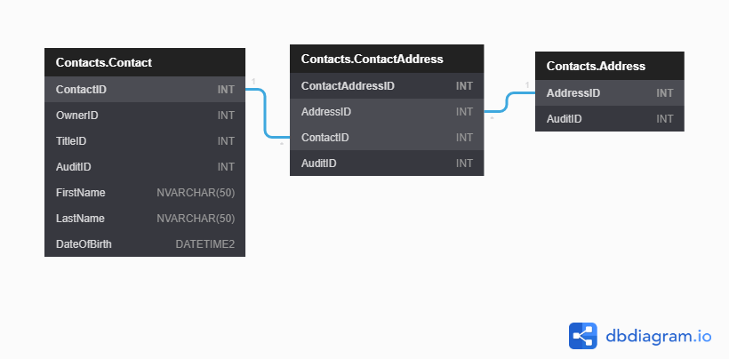 Fig 1. Database Entity Relationship Diagram for the Admin Assistant Contacts Module - (Click for larger size)