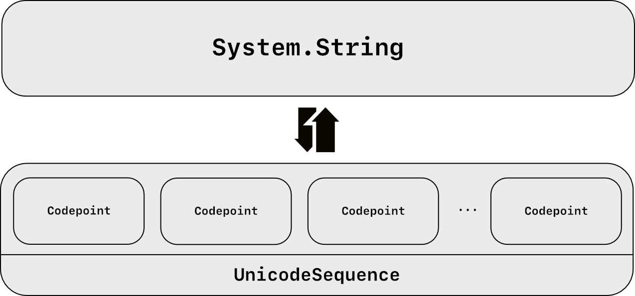 A Unicode sequence is a, well, sequence of one or more Unicode codepoints (in any of the three Unicode encodings mentioned above). Such a sequence can be used to represent just one symbol (such as the Arabic ο» or the see-no-evil π emoji), or they can be the representation of multiple such letters used to form a sentence (i.e. a string). There exists a direct mapping from UnicodeSequence to System.String, though it is important to note that this mapping is not unique, in that multiple, different UnicodeSequence values can map to a single string (here the concept of string normalization comes into play, where there is only one "canonical" Unicode representation for any given string, but that is outside the scope of this primer).