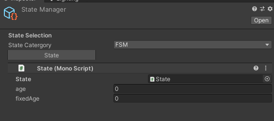 Rather than handling states through ScriptableObjects or MonoBehaviours, all states are light classes that are all collected and edited within the FSM Manager. From the FSM Manager, custom default values can be assigned without requiring any form of recompile or edit to the original script.