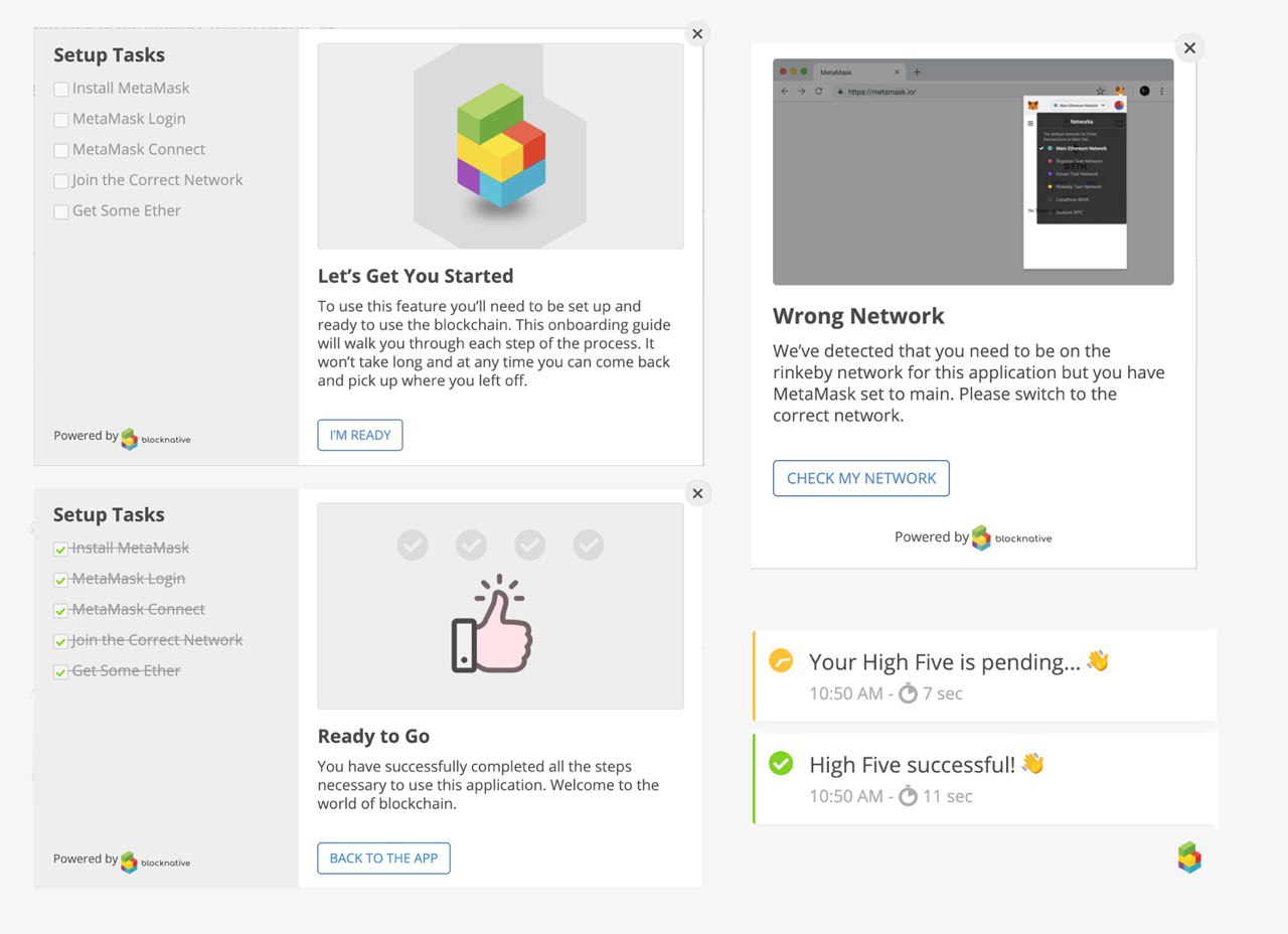 })The first three steps in the getting started flow will get your users onboarded. This step adds transaction support in order to help guide your users through a series of issues that can arise when signing transactions.