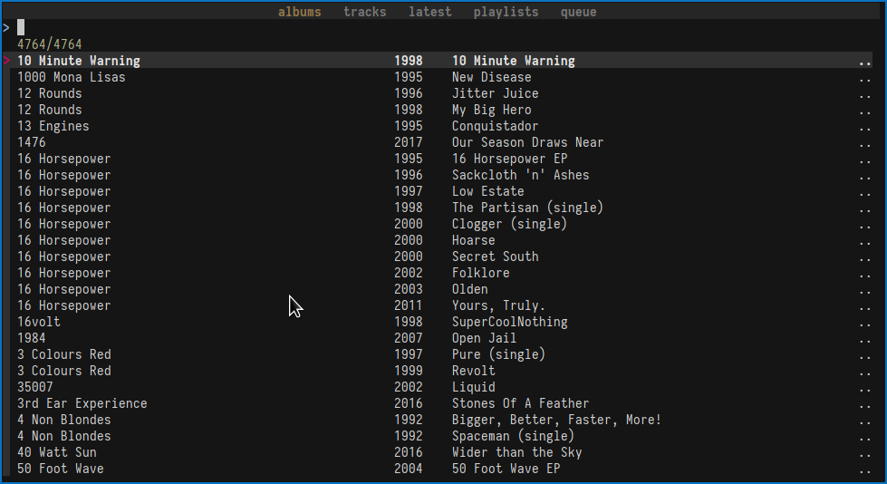 F5: queue view (uses ncmpcpp by default, can be changed in clerk.conf)