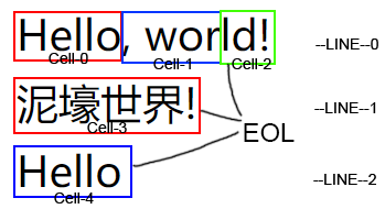 如果为每一个字符赋予上面所述的一些属性, '性价比'很低: 一个字符也就几个字节, 属性需要的空间可能是其几十倍. 所以自己将一段文字划分成一个元胞(Cell), 或者说'块'(Block). 根据个人习惯, 还是称为Cell.