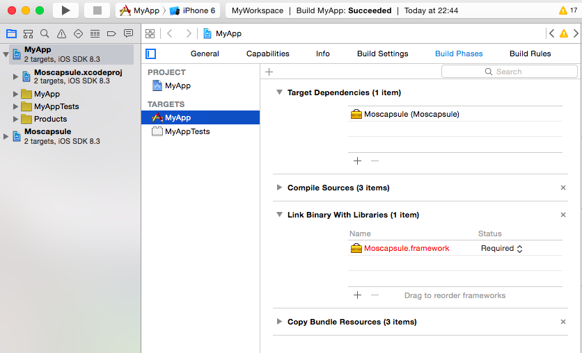 d) Open workspace and drag & drop your project and Moscapsule.xcodeproj into Navigation.