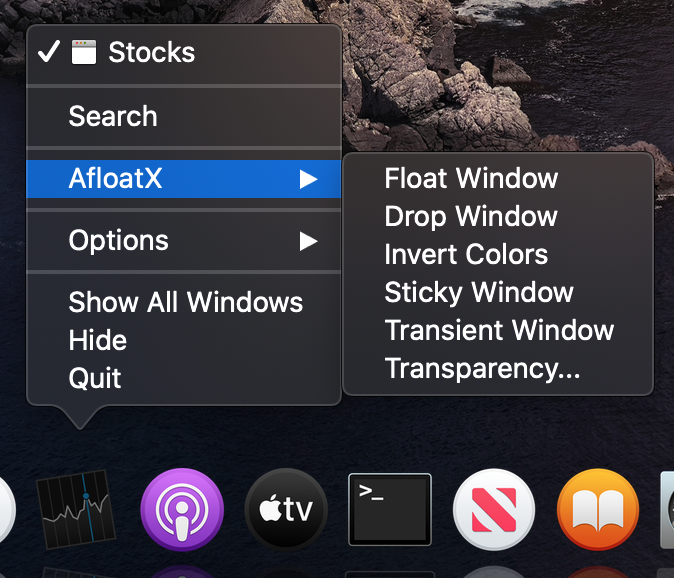An alternative to Afloat that lives in the dock icon menu. Although AfloatX has some of the same features as Afloat, it is not meant to be a clone. AfloatX is a simple and unobtrusive plugin made to add some additional window management features.