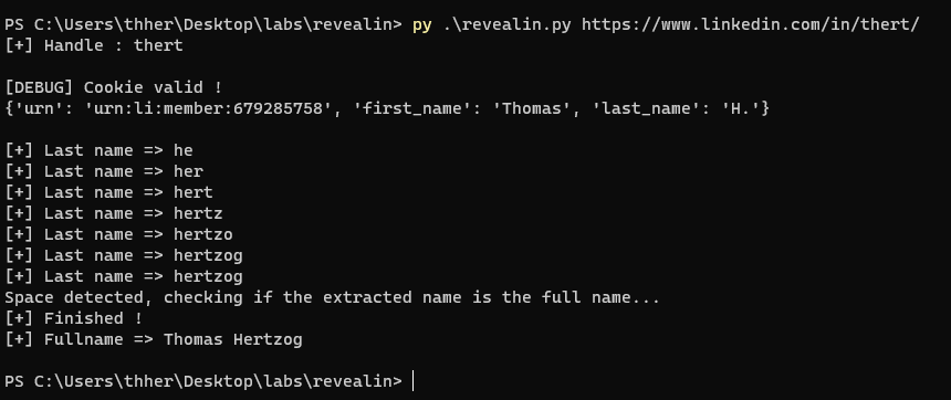 Revealin Uncover the full name of a target on Linkedin. It's just a little PoC exploiting a design flaw. Useful for OSINT. Screenshot Usage $ git clone https://github.com/mxrch/revealin && cd revealin $ python3 revealin.py <handle / profile link>