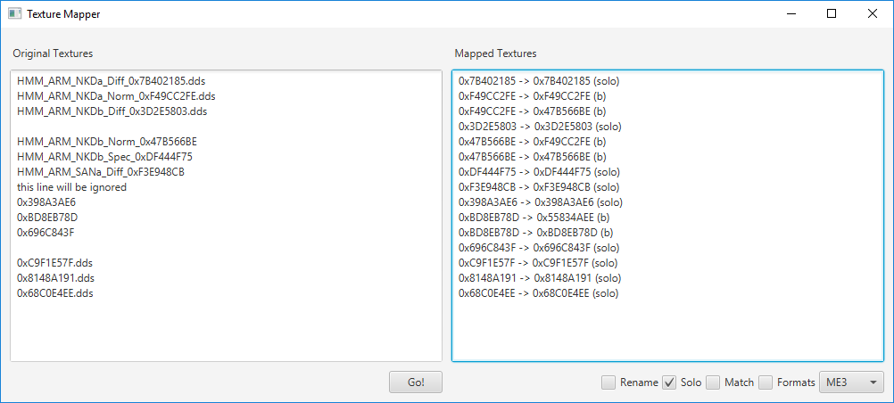 Click Go. The tool will match your hashes with the database, and create a batch file (.bat) in the directory you ran it from. It will be named ME1.bat, or ME2.bat, or ME3.bat, depending on which game you're porting to.