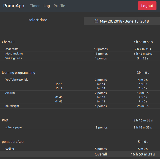 Simple pomodoro clock with user authentification and log keeping.