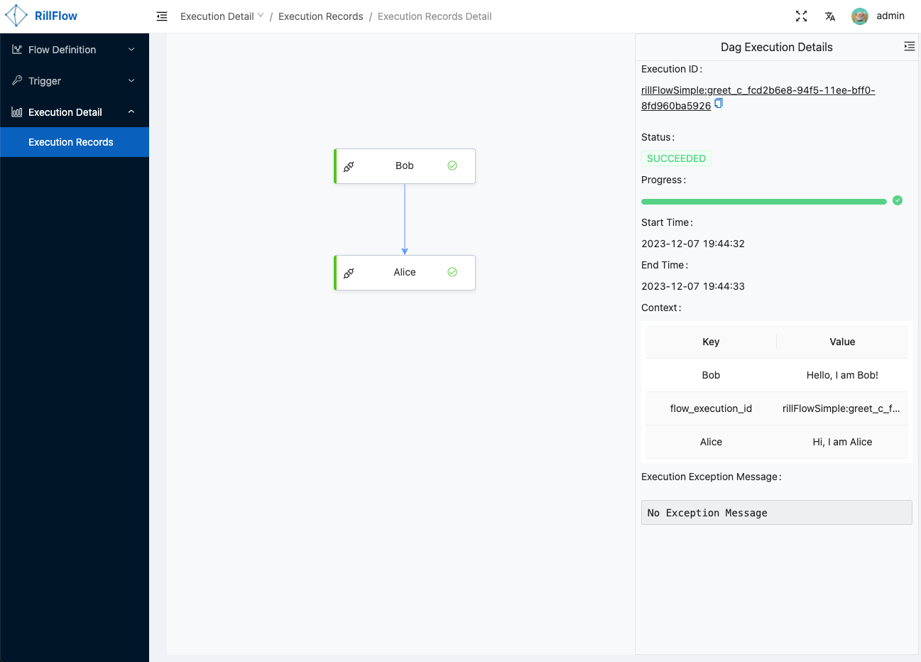 target: "$.input.Alice"- Step 3: Submit the flow graph to execute the task